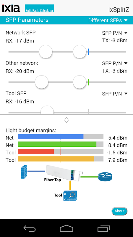 使用SFP参数部分指定的发射功率和接收您所使用的收发器的灵敏度。如果您选择“相同的SFP,”Ixia的SFP选定的速度和电缆类型自动用于所有四个端点。如果您选择“不同的SFP,”你可以通过SFP部件号从右侧的下拉列表中选择,或者你可以查查资料,你的收发器的数据表中输入它使用滑块。在下拉列表中只提供匹配的链路速度,并在顶部设置电缆类型收发器。