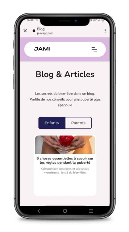 别再犹豫了,Jami 会在这个巨大变化的时期为您提供支持。我们的移动应用程序专为15至25岁的女孩设计,提供独特的个性化体验,帮助您更好地了解和掌控自己的身体,成为自己健康的行动者。
