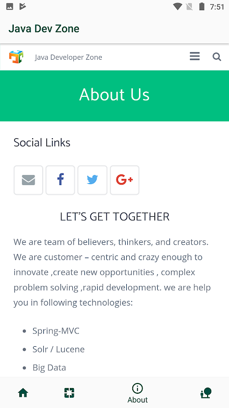 We are team of believers, thinkers, and creators. We are customer – centric and crazy enough to innovate ,create new opportunities , complex problem solving, rapid development. This application contains articles related to following Java Frameworks: