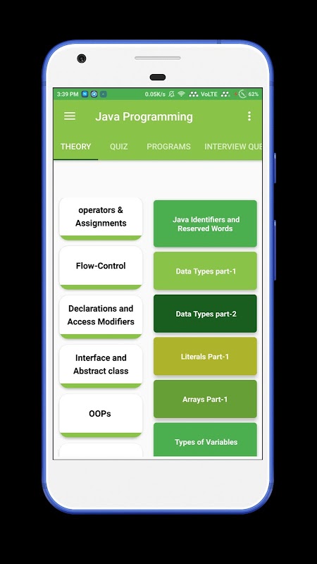 这个应用程序使您可以在Android设备中携带基本的Java编程教程。