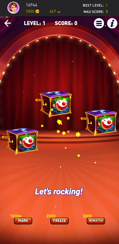 游戏开始时,一个小丑藏在一个盒子里。点击开始按钮,小丑藏在盒子里,盒子开始移动。等盒子停止移动后,找到藏有小丑的盒子。