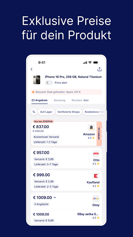 看到商品?将商品发送至 JOSEPHA 应用,即可在几秒钟内找到哪家商店可以更便宜地购买同款商品。有了 JOSEPHA,您无需再花费数小时亲自搜索最优价格。JOSEPHA 会在整个网络上搜索您商品的所有价格。探索这款智能替代平台的优势,超越 Idealo、CHECK24 等其他平台。