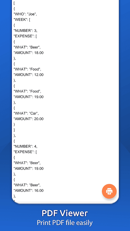 JSON file reader allow you to convert json into pdf file by a single click. You can view all converted pdf files within the app and view pdf file within built-in pdf viewer. The built-in pdf viewer allow you to print pdf file easily. JSON reader also allow you to pick pdf file from device storage to view it.