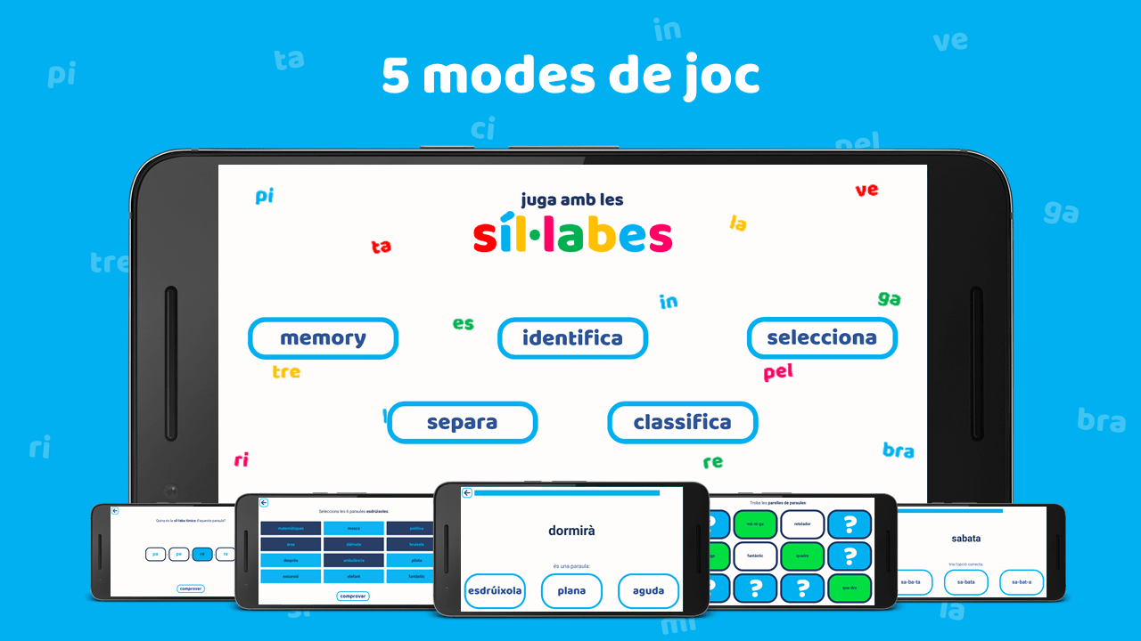 🎯Una app, cinc jocs: Tenim 5 modes de joc de dificultat creixent, que acompanyen a l’alumne des que aprèn què és una síl·laba fins que és capaç de classificar agudes, planes i esdrúixoles.