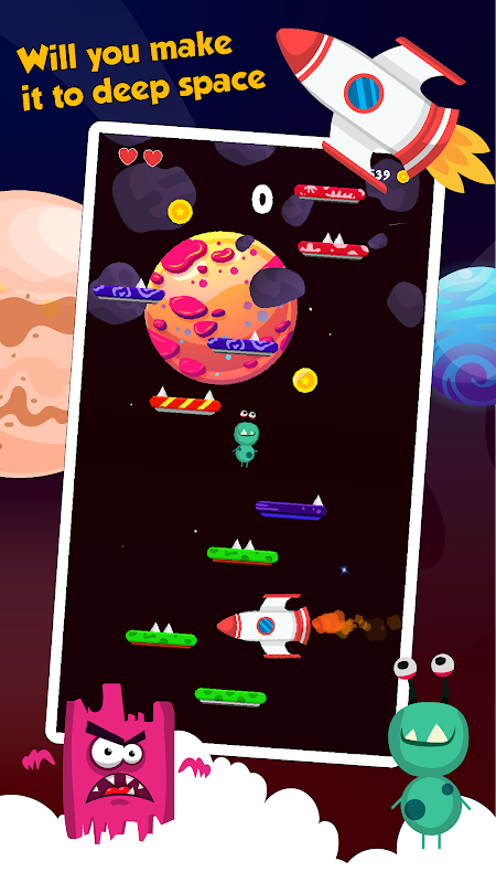 . Infinite Alien jumping. . Explore space and discover planets. . Kill enemies and get the highest score ever. . Choose the character you like and play with it.