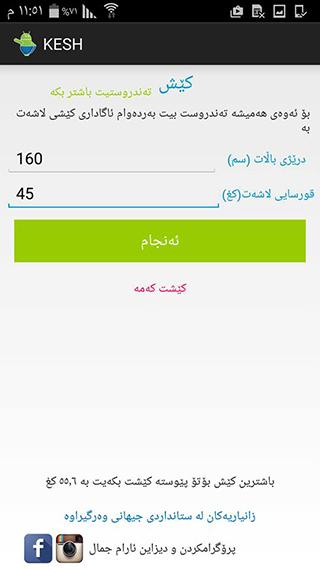 بەرنامەی کێش بەرنامەیەکی سادە و جوانە بۆ مۆبایلەکانتان کە لەڕێگەی ئەم بەرنامەیەوە دەتوانیت بزانیت ئایا کێشت زیادە یان کەمە و باشترین کێشی گونجاو چەندە بۆ لاشەی تۆ بە بە تاقیکاری ستانداردی جیهانی هەژمێر کراوە . لە ماوەی داهاتوودا دەتوانن لە گۆگڵ پلەی دایبگرن ، ولە داهاتوودا بۆ ئامێرەکانی وەک ئایفۆن و ویندۆس فۆن بەردەست دەبێت . لەگەڵ ڕێزی براتان : ئارام جمال