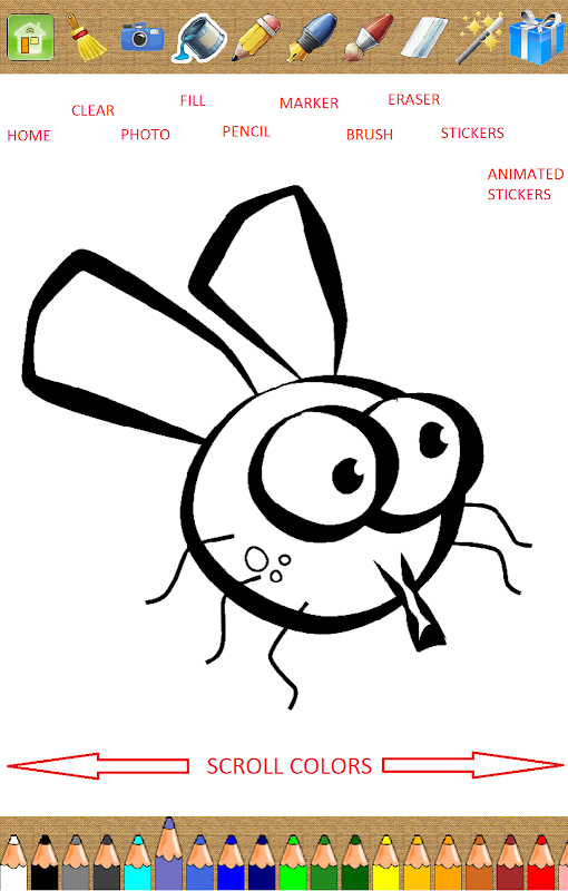 绘制线条粗细不同的笔线:钢笔,记号笔和铅笔,使用橡皮擦校正所有绘制的图片,自动填充任何闭合的形状,它也适用于您创建的轮廓。放置漂亮的贴纸,例如叶子和花朵,有趣的脚形,瓢虫等等。要保存驱动器上的位置,请在按照片按钮决定时保存图片。