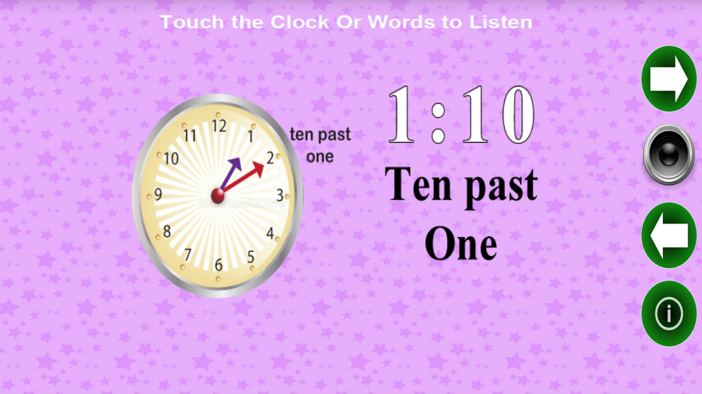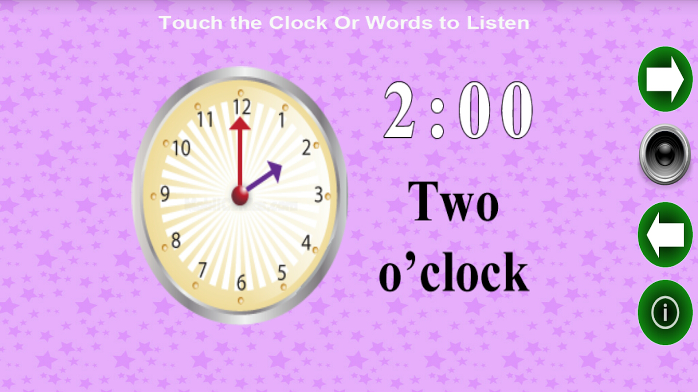Visually represents analog clock & digital time through pictures. And kids can touch the pictures and words to listen how to say/read it out.