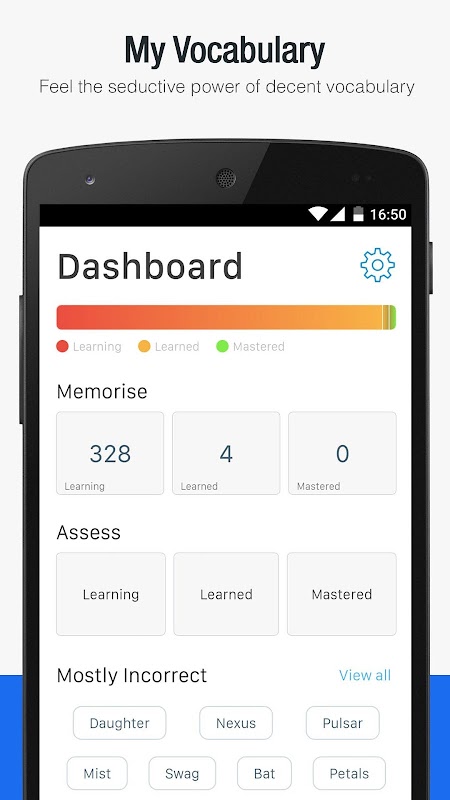 用户通过个性化的自适应修订词汇测试来评估他们的表现。评估以多项选择的形式进行。借助这款离线 android 词典评估您的知识将帮助您提高词汇量。您可以根据单词的印地语含义从单词列表中选择正确的单词来评估您的英语词汇量。