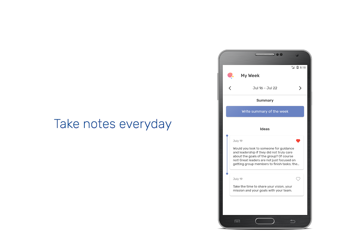 Klara needs 5 minutes of your time every day and 20 minutes of your time every week. The 5 minute journal concept makes sure you are just focusing on the most important events of your day while considering both motivational events and of course your mistakes and flaws. At the end of the week, you will have 20 minutes to summarise your week and think about your good habits and bad habits during the week.