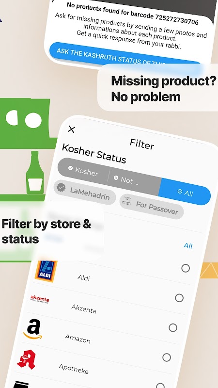 这就是它与 KosherScan 配合使用的方式,该应用程序可让您找到犹太洁食产品,并由您的拉比回答。无需在线查找产品、浏览长列表或询问您的朋友。只需扫描您的杂货上的条形码,找到已经回答的产品,如果产品还没有回答,您的拉比会快速回答。