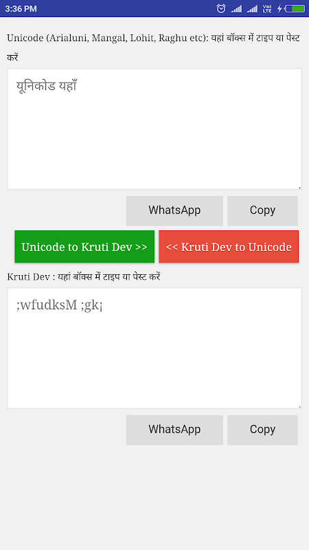 Free Kruti Dev to Unicode And Unicode to Kruti Dev Converter Android Apps with Whatsapp Share and also Copy the text options.