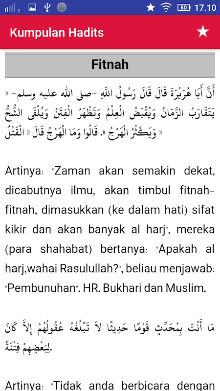 Aplikasi Kumpulan Hadits Shahih Rasulullah SAW Terlengkap. Tiap koleksi hadist ditampilkan dalam Bahasa Arab & Terjemahannya. Berisi ribuan hadist Shahih Nabi Muhammad SAW dari berbagai tema. Aplikasi offline dan tidak membutuhkan koneksi internet sama sekali untuk menggunakannya.