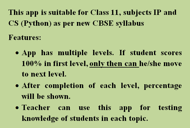 根据新的CBSE教学大纲,此应用程序适用于Class 11,科目IP和CS(Python)