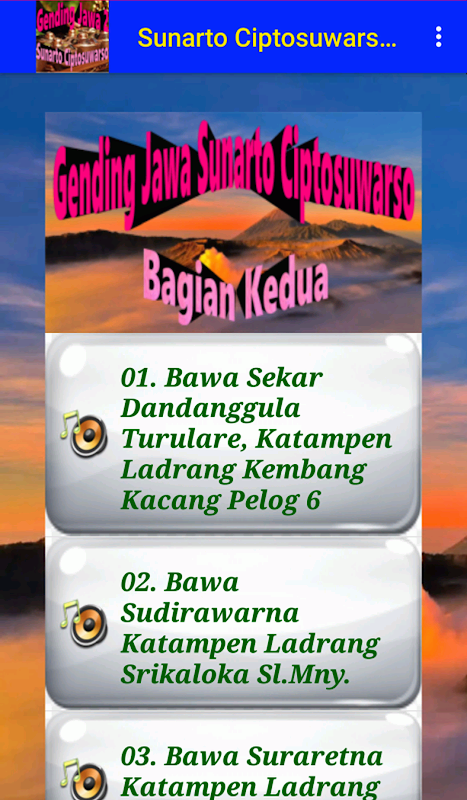 Dihadirkan aplikasi Lagu Gending Jawa Sunarto Ciptosuwarso bagian kedua yang berisi karya terbaik dari budayawan legendaris tanah jawa, Ki Sunarto Ciptosuwarso. Nikmati indahnya paduan musik Gending Jawa dengan merdunya suara Sinden-Sinden terkena tanah Jawi. Nikmati Gending Jawa terbaik dari Ki Sunarto Ciptosuwarso seperti Ketawang Kinanthi Pawukir Sl. Mnyr., Ladrang Bribil-Gonjol Slendro 9, Ladrang Kagok Madura Sl.9, Ldr. Gleyong Pl.6 , dll. Tentu aplikasi ini sangat pas digunakan para penggemar budaya Jawa, terutama seni musiknya.