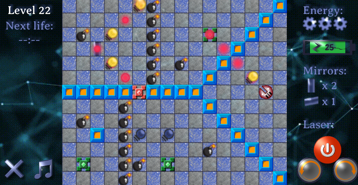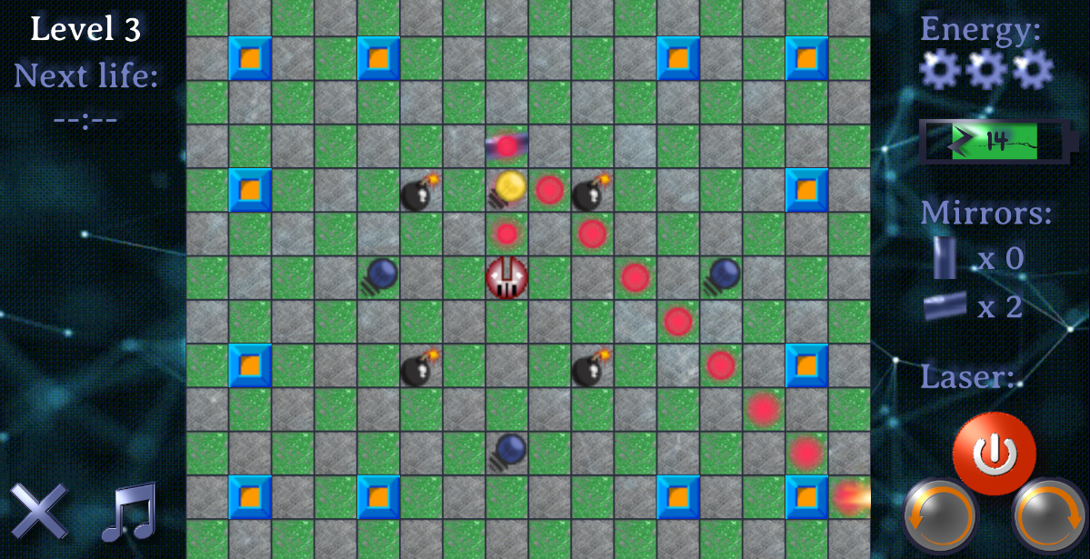 In this 2D puzzle game you're an experimental physicsts and its on you to build up an setup to activate all the lamps on the table by hitting the with a laser beam. Unfortunately, they are distributed over the whole map. Hence, you have to place different type of mirrors at the correct spots on the map in order to redirect the laser beam and hit the lamps. But since this alone would be too easy, different kind of objects like bombs, gates and blocks make this whole process a way more difficult, so you have to think twice (or more) before you activate the laser...