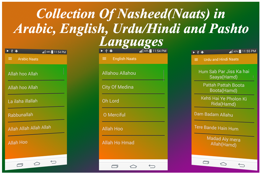 English ,Pashto ,Arabic and Hindi naats are also included in Naats (latest naats 2017) App.