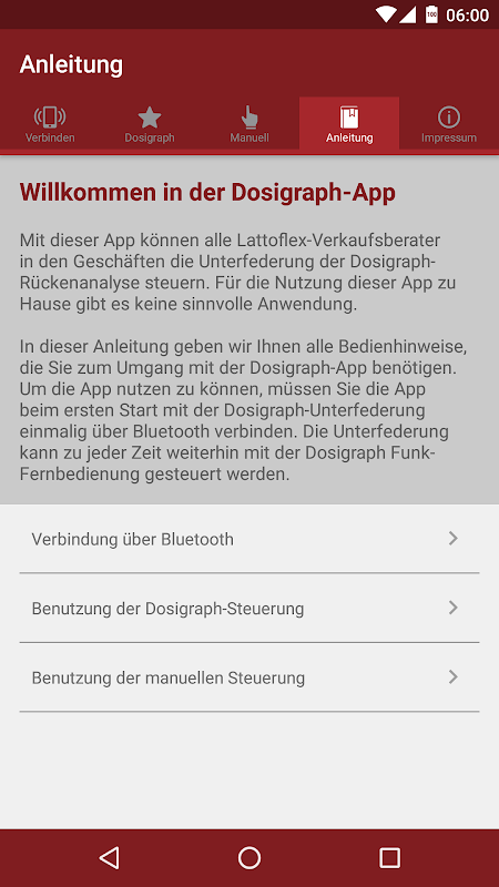 Mit dieser App können alle Lattoflex-Verkaufsberater in den Geschäften die Unterfederung der Dosigraph-Rückenanalyse steuern. Für die Nutzung dieser App zu Hause gibt es keine sinnvolle Anwendung.