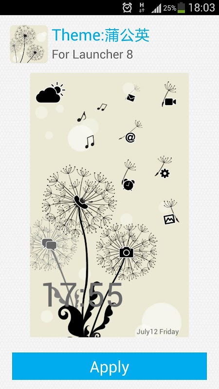 - 必须在Launcher 8 启动器中使用此主题,安装好后请直接应用此主题(Launcher 8 启动器:https://play.google.com/store/apps/details?id=com.lx.launcher8)