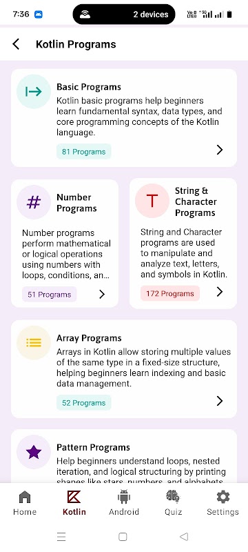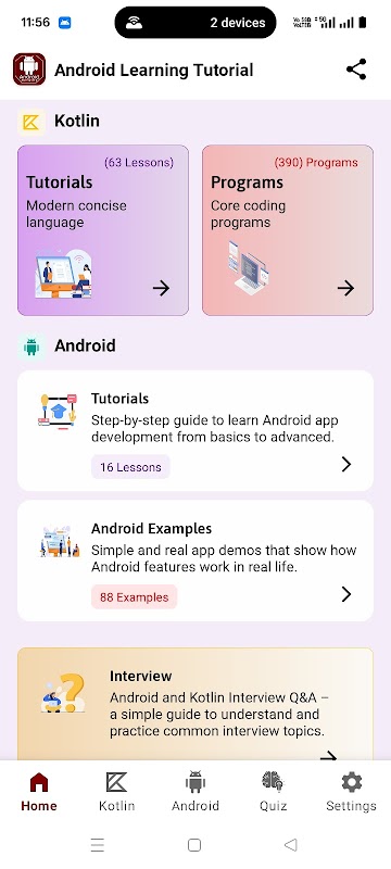 无论您是想学习 Android、Kotlin、练习 Android 示例、准备 Android 面试,还是探索 Kotlin 程序,这款应用都能满足您的所有需求。
