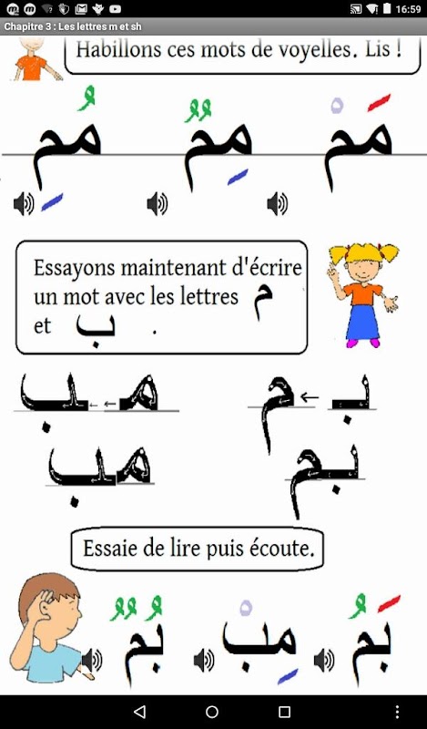 - Des exemples et exercices pour chaque nouvelle lettre apprise.