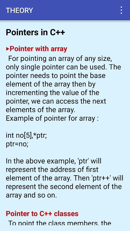 **Theory Segment :- In this section, the user can find all the basic theory and information regarding C++ Programming Language, topic-wise. This section is subdivided into various topics meticulously for better understanding of learner. These topics are well sequentially arranged for easy accesses, and the information is instantly retrievable, accordingly.