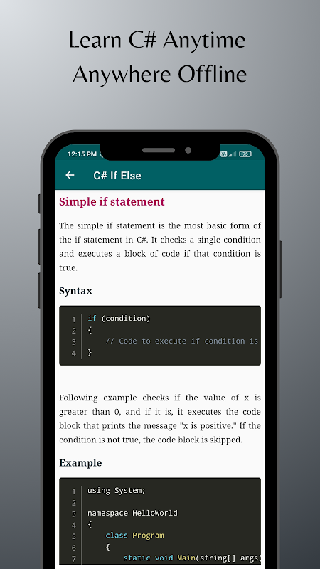 想学习 C# 吗?别再犹豫了!该应用程序提供全面的学习体验,涵盖从基本语法到高级概念(例如面向对象编程和异常处理)的所有内容。无论您是一个完全的初学者还是想提高自己的技能,这个应用程序都是您的完美伴侣。