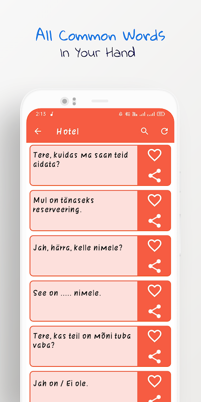 初学者学习爱沙尼亚语应用程序有 27 个不同的部分。它们是~学校、工作、动物、运动、面试、审讯、常用句子、酒店、日期、问题、餐厅、汽车、颜色、数字、医生、方向、交通、身体、时间、感情、市场、旅行和自然,介绍、天气、占星术、问候和购物。这些类别足以满足您在这些情况和地方需要学习的大多数句子。