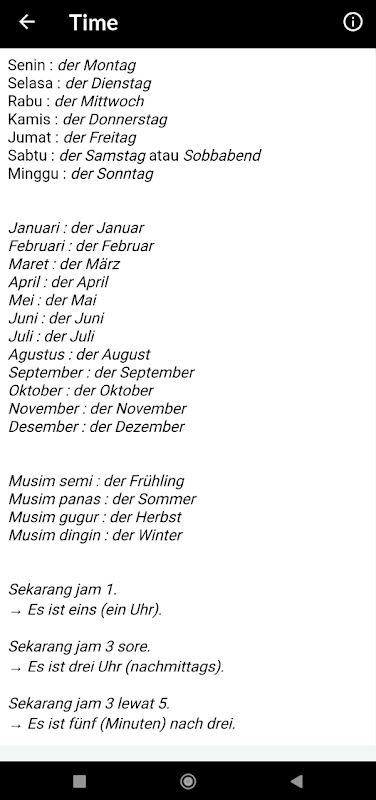 Aplikasi ini berisi alphabet yang lengkap, greetings, percakapan sehari-hari yang sering kita gunakan, angka dalam bahasa Jerman, dan banyak pengetahuan yang bisa kalian dapat dari sini.