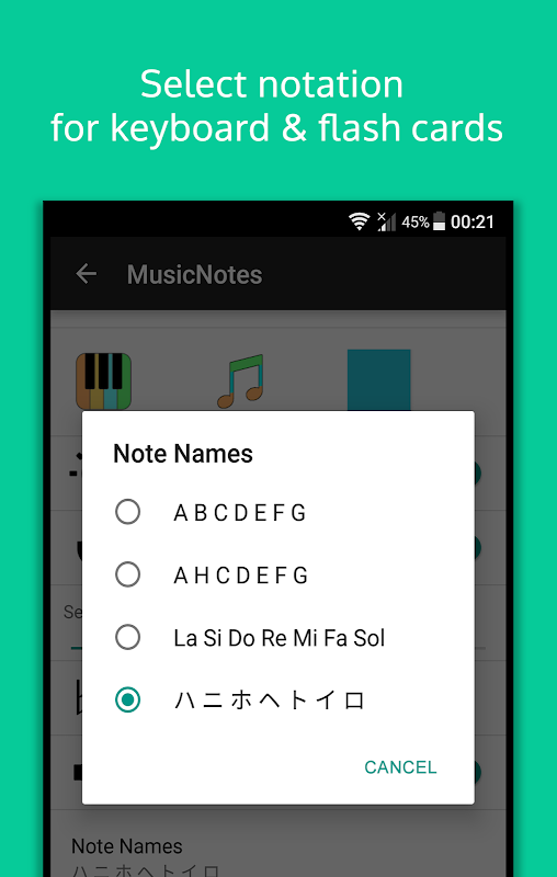 主要功能迎合学习偏好,包括音符命名惯例、音乐音阶和五线谱(低音、高音)。该应用程序还可以灵活地调整麦克风灵敏度、选择音符换位的声源以及设置倒计时计数器作为您的音乐学习目标。