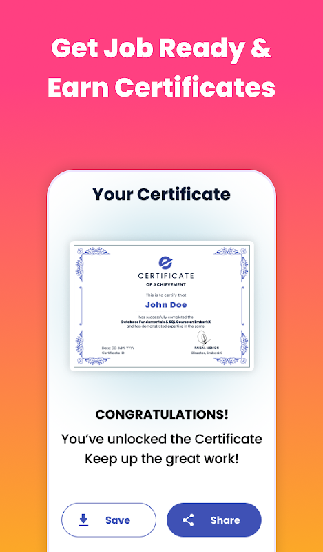 完成每个模块后,您将获得 SQL、MySQL、PostgreSQL 和 MongoDB 认证。将这些认证添加到您的简历或领英 (LinkedIn) 中,展现您在数据库管理系统方面的专业知识。