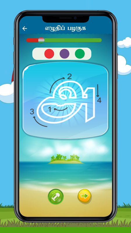 2. 文字写作 (எழுதிப்பழகு) - 孩子们可以练习泰米尔语单词,并使用不同的颜色和大小从起点到终点显示绘图线。