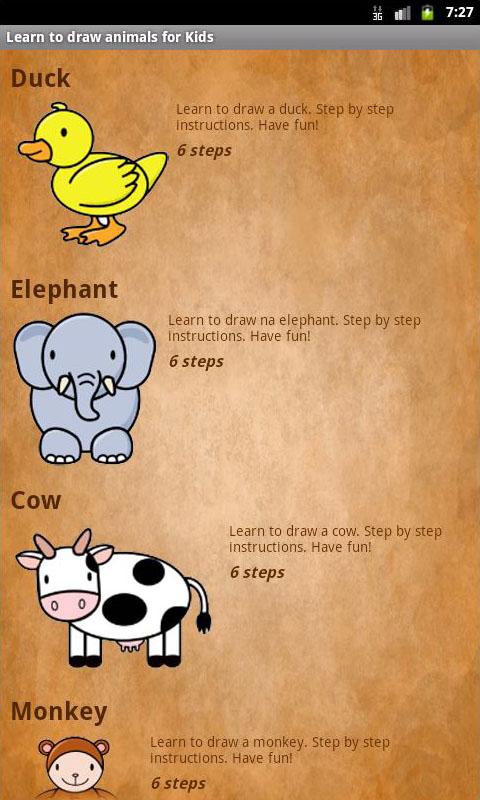 Very simple animal drawings for children age 5 up to 10 years old. They will enjoy the simple interface with step-by-step instructions. Children only have to slide to see the next instruction.