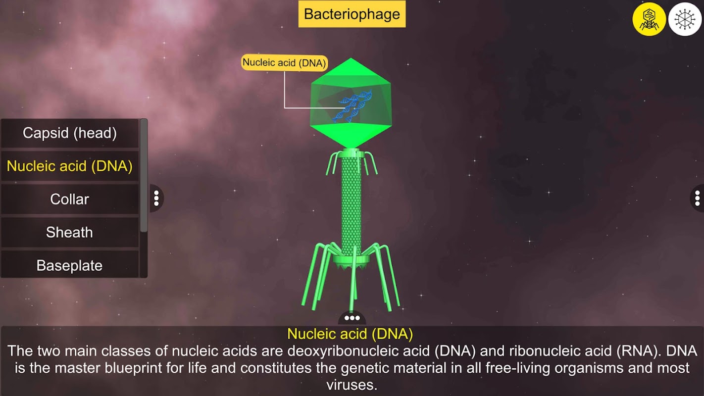 这个应用程序有两个与病毒相关的 3D 模型。您可以通过点击窗口标签查看每个模型的信息,这有助于用户了解病毒。这个应用程序对于病毒研究的学生和教师很有用。通过放大、缩小和旋转,您将能够在 3D 天使中更好地看到该模型,从而更好地了解它的部分。以及那些想要进行与病毒相关的研究的人,此应用程序可能很有用。