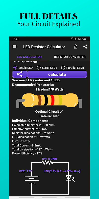 LED Resistor Calculator 具有全面的功能集,是任何使用 LED 和电阻器的人的完美工具。它可以帮助您计算 LED 和电阻的串联限流电阻、额定功率和功耗,以及通过 LED 的有效电流。我们的应用程序还可以有效地计算当前电路的功率效率,并为您的 LED 推荐容差为 5% (E24) 或 10% (E12) 的合适标准电阻器。