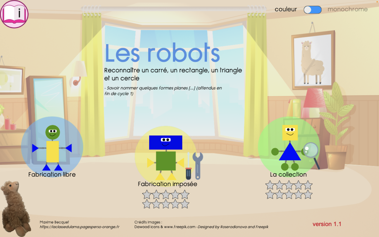 - 孩子必须找到描述的机器人(2 种形状和两种不同的颜色)
