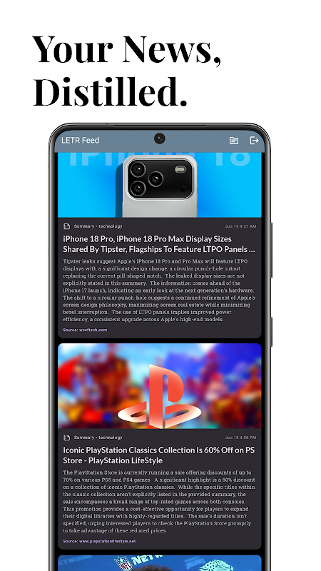 LETR 能随时随地提供你需要了解的精华内容,去除浮夸。我们将铺天盖地的新闻转化为简洁易读的摘要,并根据你的兴趣进行定制。
