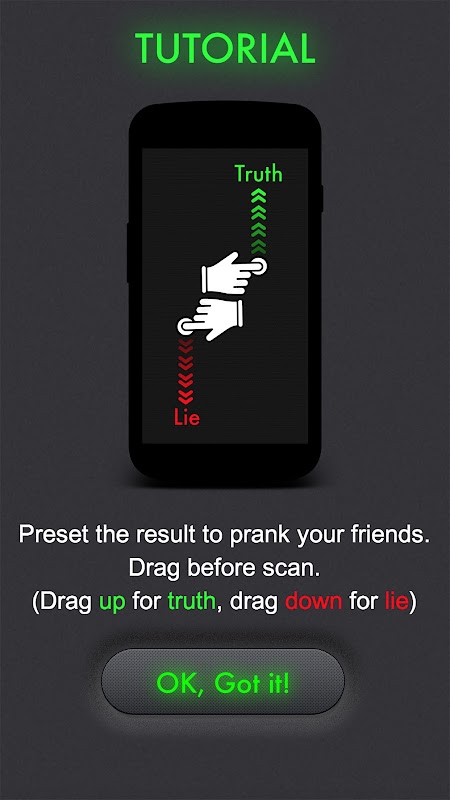 Lie Detector 2021 simulates a fake finger print scanner to give a fake result. The fake lie detector result will be TRUE(truth) or FALSE (lie).