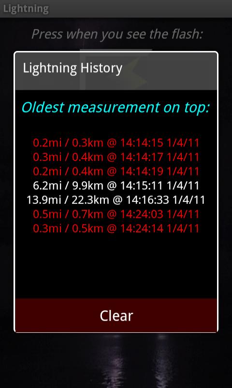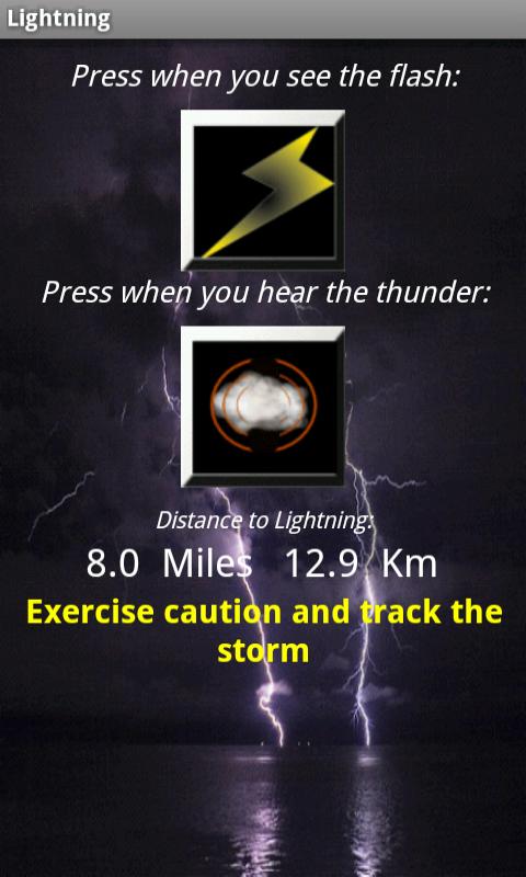 The original Android Lightning distance calculator. Press the top button when you see the flash, press the bottom one when you hear the thunder. The distance is shown in Miles and KM, up to 20 Miles. If you like, you can also start and stop the timer with the Camera button, trackball, or D-Pad.