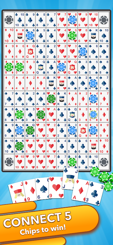 蓝色 J 牌是百搭牌。选择蓝色 J 牌可以让您将筹码放置在棋盘上的任何空位上。这些牌通常用于阻止对手获得一行,或者完成您自己的一行。