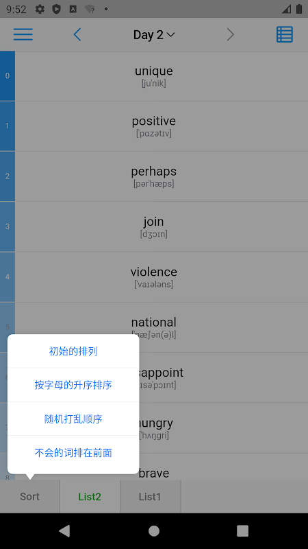 初始的排列,按字母升序排序,随机打乱排序,不会的词排在前面。
