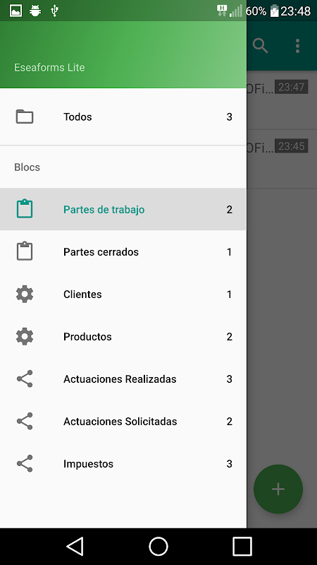 Eseaforms Lite te permite tener una base de datos de clientes, productos, actuaciones solicitadas y realizadas, crear partes de trabajo y generar PDFs con los datos introducidos, además de capturar la firma de tus clientes.