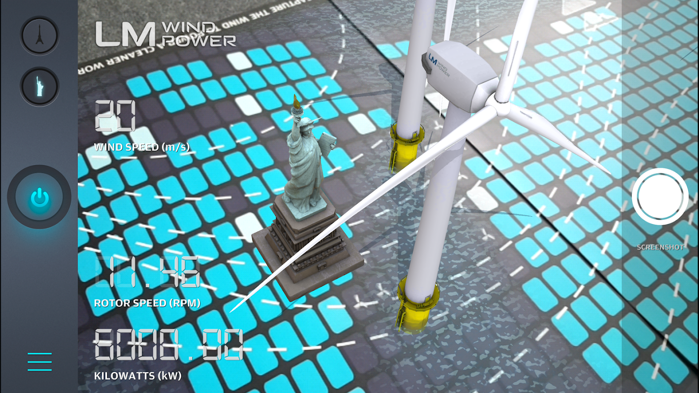 The LM Wind Power app utilizes Augmented Reality in order to visualize a 3D presentation of offshore wind turbines, using parts and technology supplied by LM Wind Power. The interface is customized to visualize an accurate representation of the rotational speed and resulting power efficiency at different wind speeds.