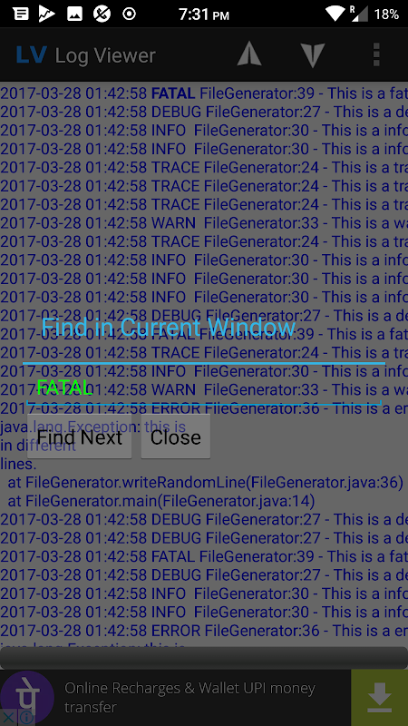 这是一个日志文件的查看器,可能比RAM大小更大。用户可以设置以块为单位加载文件的缓冲区的大小。将继续添加功能。您还可以通过打开方式或在其他/外部应用程序中共享或从电子邮件附件打开其他文件查看器中的* .log / * .txt文件。