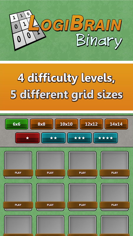 LogiBrain Binary 包含 2000 多个不同大小和难度级别的谜题:简单(1 星)、中等(2 星)、困难(3 星)、极难(4 星);