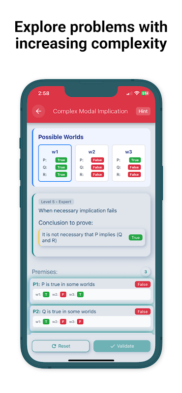 这款应用引导用户通过动手解决问题来系统地思考。每个谜题都提出了一个逻辑或哲学上的挑战,用户需要逐步构建从前提到结论的论证链,从而训练自己分析论证、发现模式并进行精确推理的能力。这种主动学习方法将抽象的逻辑概念转化为直观、具体的技能。
