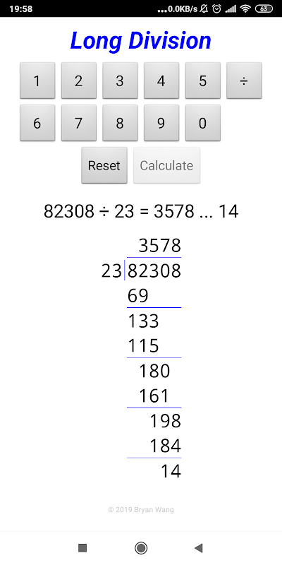 该应用程序显示两个整数相除的长除法。它支持最多6位数字的除法。