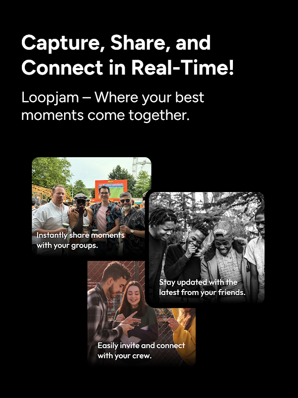 Loopjam 让您可以轻松地与群组实时分享照片和视频。无论是婚礼、节日、假期还是夜晚外出,您的所有回忆都将整理在一个地方 - 活动结束后不再追着朋友拍照。