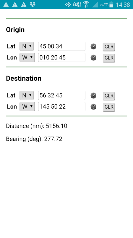 Determines the distance and the bearing of a rhumb line (loxodrome) between two locations, each defined by geographic coordinates.