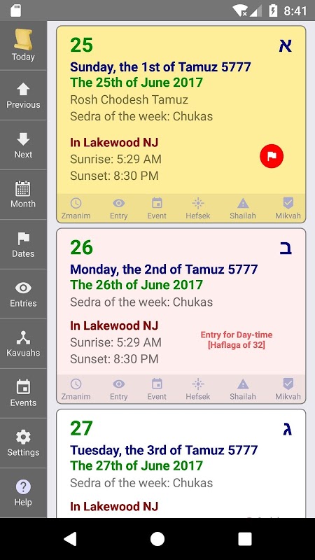 Luach 还具有 Zmanim 日历的功能,并包括适用于世界任何地方的全套每日 Zmanim。这包括点蜡烛时间、一周的晚宴、所有假期和斋戒、Zman Kriat Shma 以及许多其他的。